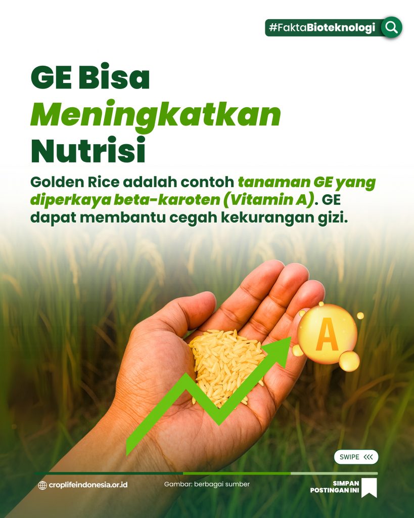 Salah satu keberhasilan GE adalah Golden Rice, padi yang diperkaya beta-karoten sebagai prekursor vitamin A. GE juga digunakan untuk meningkatkan zat besi, protein, dan antioksidan pada berbagai tanaman. Ini membuktikan bahwa GE justru bisa meningkatkan gizi, bukan menurunkannya.