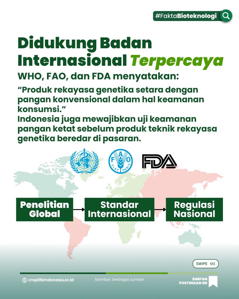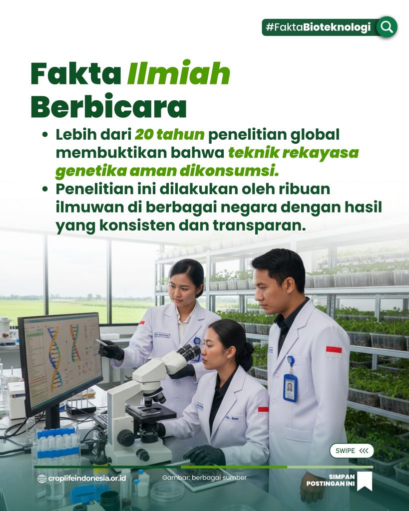 Tidak ada bukti ilmiah yang menyatakan bahwa teknik rekayasa genetika membahayakan kesehatan. Pangan teknik rekayasa genetika telah dikonsumsi ratusan juta orang selama dua dekade tanpa insiden besar. Keamanan produk teknik rekayasa genetika dijamin melalui regulasi internasional dan nasional. Fakta ini harus menjadi dasar dalam menyikapi informasi yang beredar. Ilmu pengetahuan memberi jawaban: teknik rekayasa genetika aman untuk dikonsumsi.