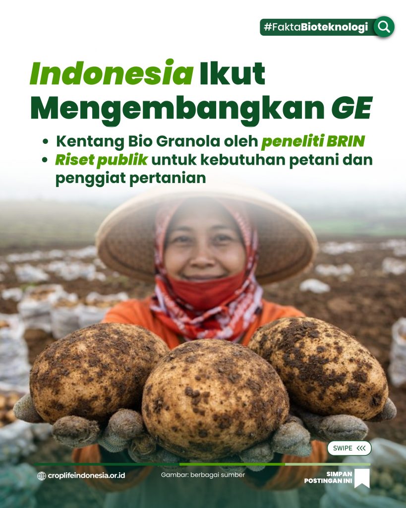Di Indonesia, peneliti lokal turut mengembangkan GE untuk menjawab tantangan domestik. Kentang Bio Granola oleh BRIN menjadi contoh riset publik yang ditujukan untuk petani dan ketahanan produksi. Pengembangan GE membutuhkan uji lapang, validasi ilmiah, dan adopsi di tingkat petani yang hanya efektif melalui kolaborasi pemerintah, kampus, dan komunitas tani.